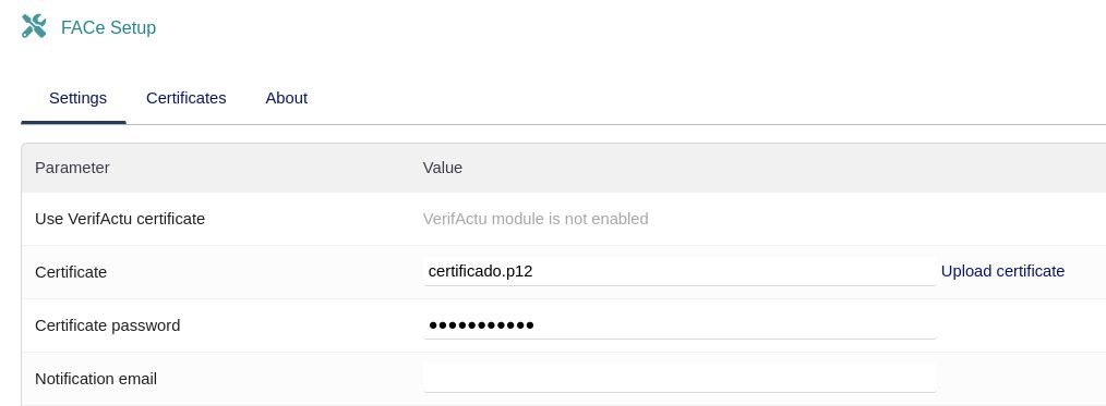 FACe permite generar facturas electrónicas firmadas directamente desde Dolibarr para remitirlas al portal FACe del Gobierno de España (face.gob.es). En la configuración del módulo se sube un certificado oficial (.p12) con su contraseña, o si se dispone del módulo VerifActu, se puede reutilizar el certificado ya configurado en él. Al validar una factura en Dolibarr, si el tercero tiene activado el campo FACe (faceenable), al generar el PDF se crea automáticamente también el documento firmado en formato Facturae 3.2.1 (.xsig). Antes de remitirlo, se puede comprobar el contenido del XML generado desde la herramienta de verificación (custom/face/view_xml.php) para revisar que todo es correcto. Una vez verificado, el fichero .xsig se sube manualmente al portal face.gob.es para su presentación ante la Agencia Tributaria.