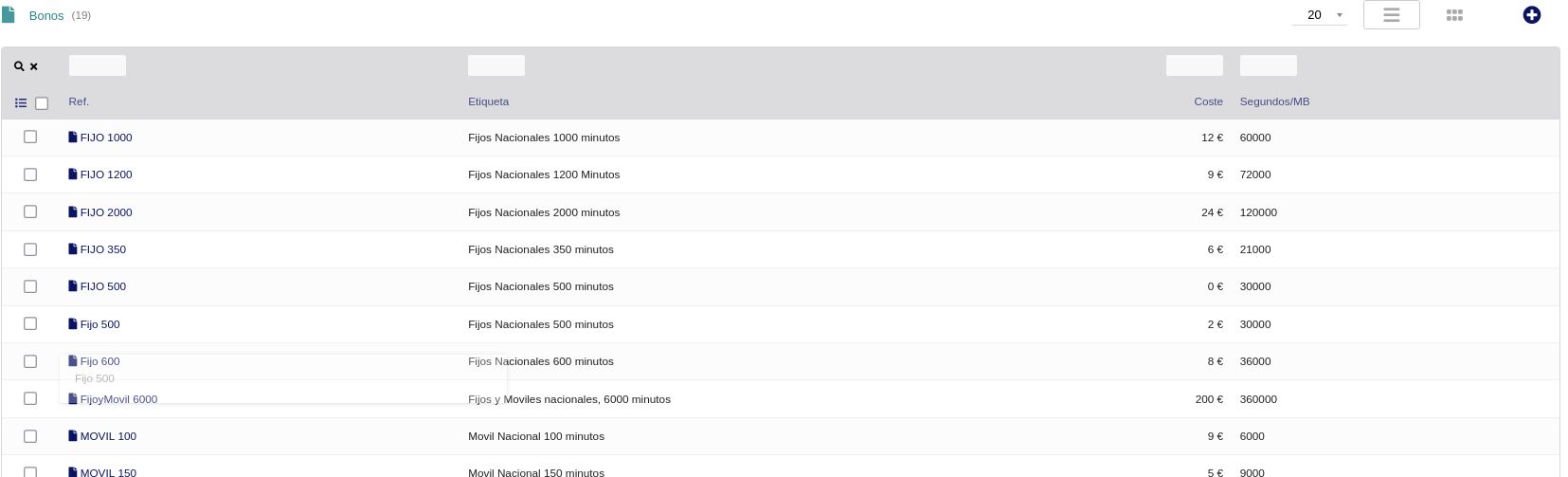 • Define bonos (paquetes de minutos/MB) como FIJO 500, MOVIL 150 o FijoyMovil 6000, con coste y segundos/MB incluidos