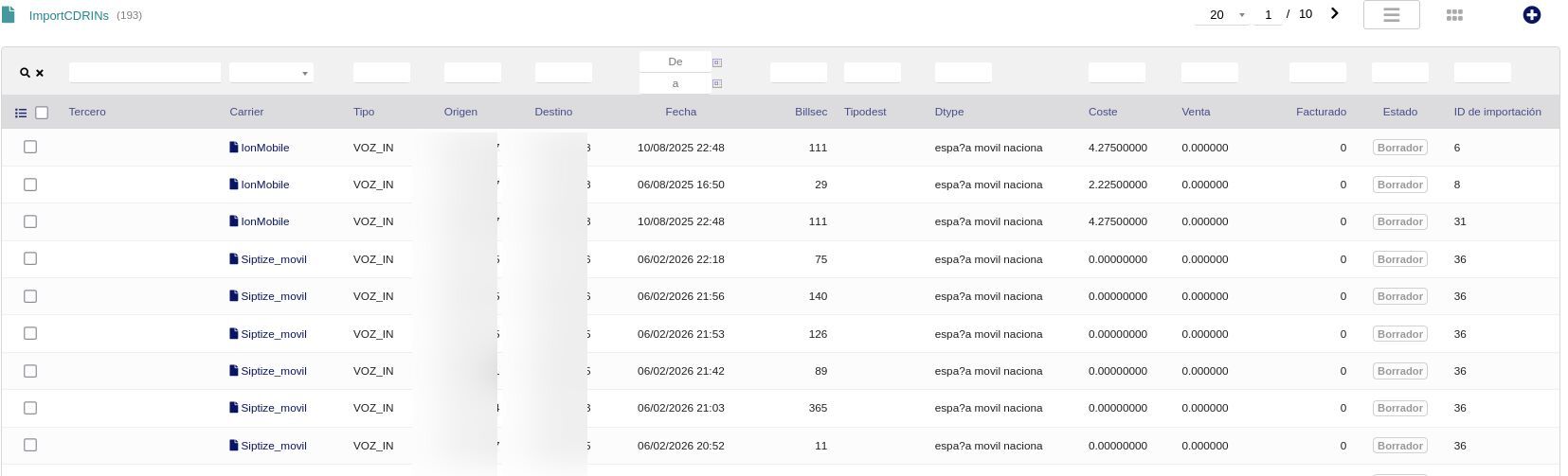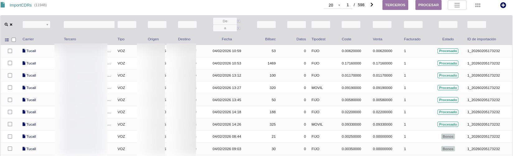 • Visualiza los CDR importados con carrier, tercero, tipo, origen, destino, fecha, duración, tipo destino, coste, venta, estado (Procesado/Bonos) e ID de importación