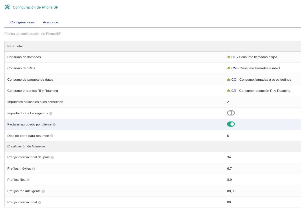 • Configura los productos de facturación (consumo fijo, móvil, otros, roaming), tipo impositivo, días de corte y clasificación de prefijos (país, móvil, fijo, red inteligente, internacional)
