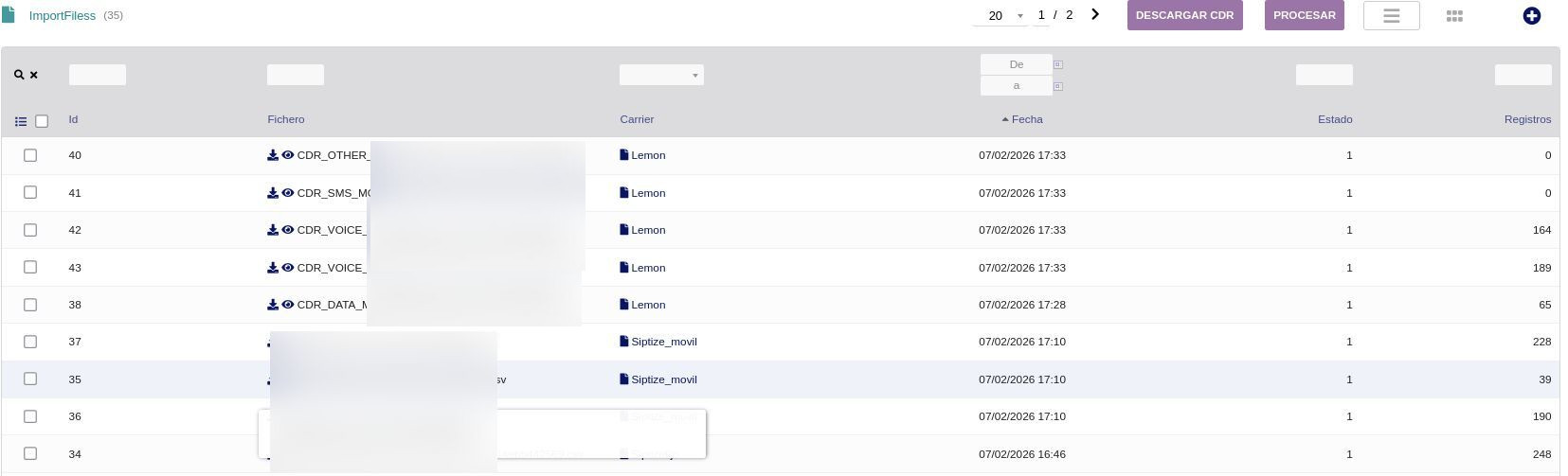 • Consulta los ficheros importados con su carrier, fecha, estado y número de registros; descarga CDR o lanza el procesado
