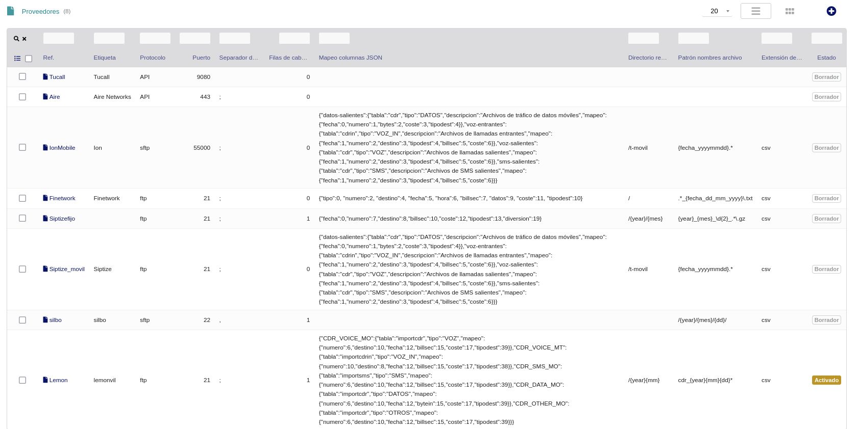 • Proveedores con tipo de conexión (API, FTP, SFTP), puerto y mapeo JSON de columnas del fichero CDR.