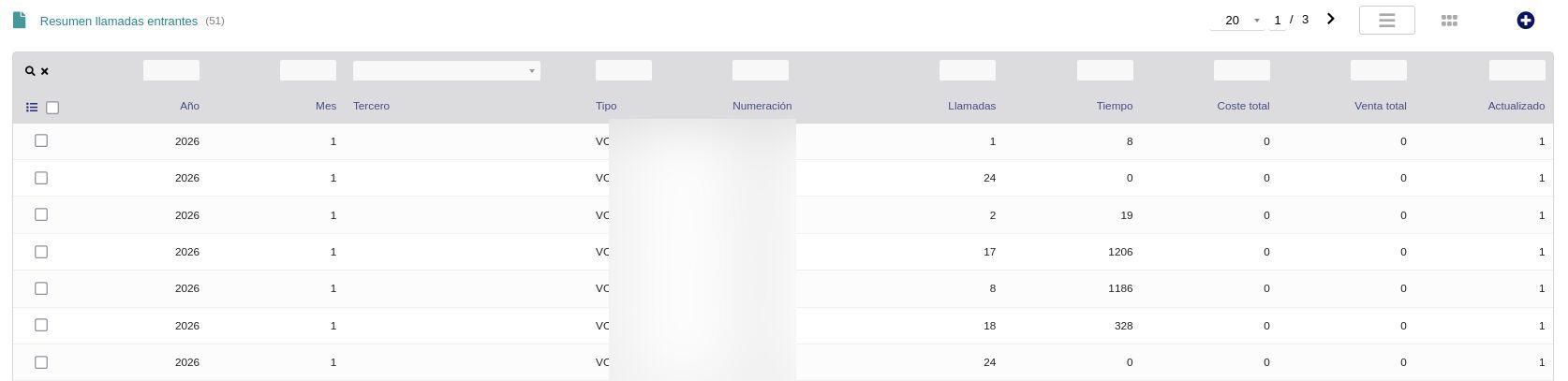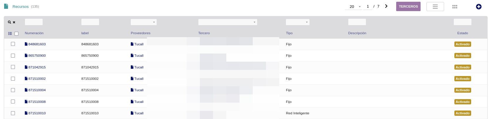 • Recursos de numeración: números de teléfono asignados por tercero, proveedor, tipo (fijo, red inteligente) y estado.